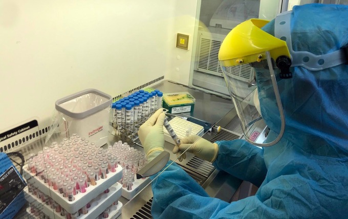 Nhân viên khoa Vi sinh, Bệnh viện Nhi đồng thành phố gấp rút làm xét nghiệm nCoV trong đợt lấy mẫu khẩn toàn viện ngày 12/5. Ảnh: Bệnh viện cung cấp