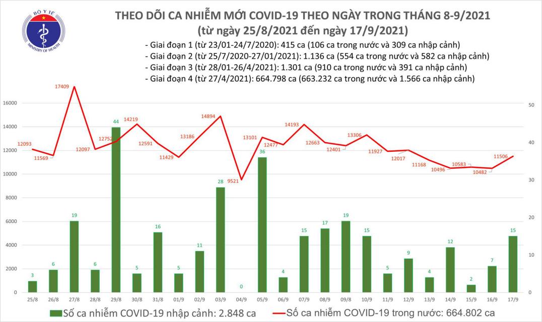 Bản tin dịch COVID-19 tối 17/9 của Bộ Y tế cho biết có 11.521 ca mắc COVID-19, trong đó TP HCM và Bình Dương cộng lại đã gần 10.000 ca; trong ngày có hơn 9.900 bệnh nhân khỏi.