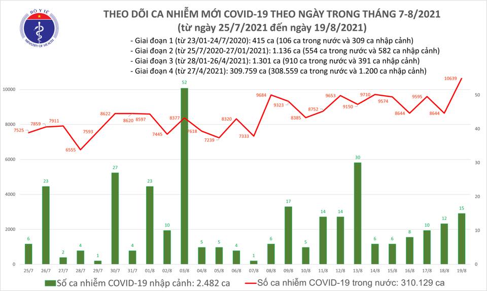 Bản tin dịch COVID-19 tối ngày 19/8 của Bộ Y tế cho biết có thêm 10.654 ca mắc COVID-19, TP Hồ Chí Minh vẫn nhiều nhất với 4.425 ca; Bình Dương thứ 2 với 3.255 ca. Trong ngày có 5.000 bệnh nhân khỏi.