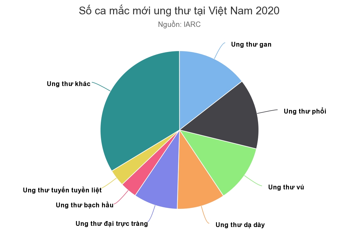 Tỷ lệ các loại ung thư mắc mới tại Việt Nam theo số liệu cập nhật 2020. Nguồn: IARC