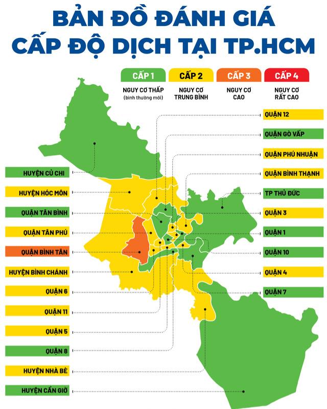 Tính đến ngày 24-10, TP.HCM đang ở cấp độ 2. Trong 22 địa phương (cấp quận, huyện và TP Thủ Đức) có 9 địa phương đạt cấp độ 1 (vùng xanh), 12 địa phương đạt cấp độ 2 (vùng vàng) và 1 địa phương cấp độ 3 (vùng cam).
