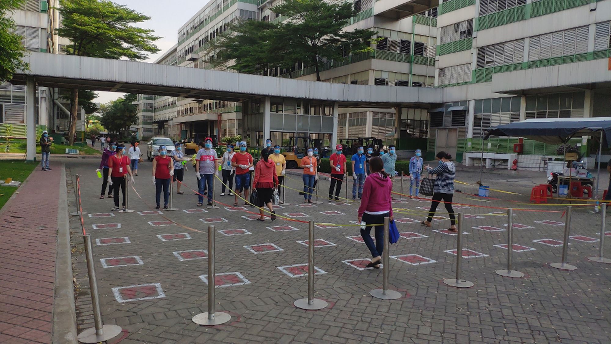 Công nhân xếp hàng vào theo khoảng cách khi vào xưởng