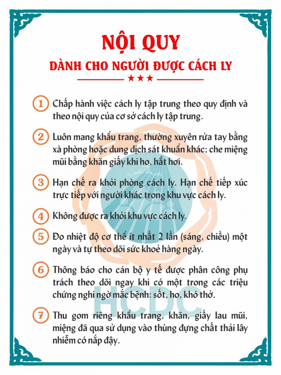 Trong khu cách ly tập trung luôn có những qui định dành cho nhân viên y tế cũng như những đối tượng được cách ly. Đối với những người đang được cách ly họ sẽ phải tuân thủ những nội quy của khu cách ly ví dụ: mang khẩu trang, hạn chế tiếp xúc với những người xung quanh, tuyệt đối không được đi ra khỏi khu vực cách ly, tuân thủ qui định về vệ sinh cá nhân...