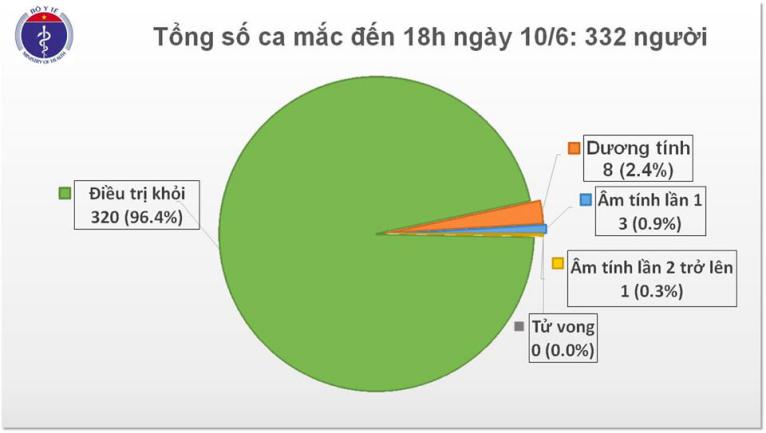 Ngày 10/6, tại Việt Nam có thêm 3 bệnh nhân được công bố khỏi bệnh, nâng tổng số các trường hợp được chữa khỏi ở nước ta lên 320/332 (chiếm 96% tổng số ca bệnh).