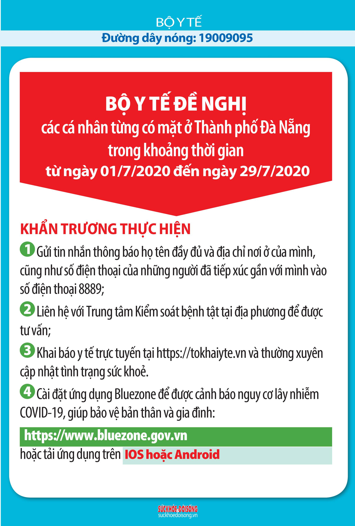Bộ Y tế đề nghị tất cả cá nhân từng có mặt ở TP Đà Nẵng trong khoảng thời gian từ ngày 01/7/2020 đến ngày 29/7/2020 cần khẩn trương thực hiện các việc sau: