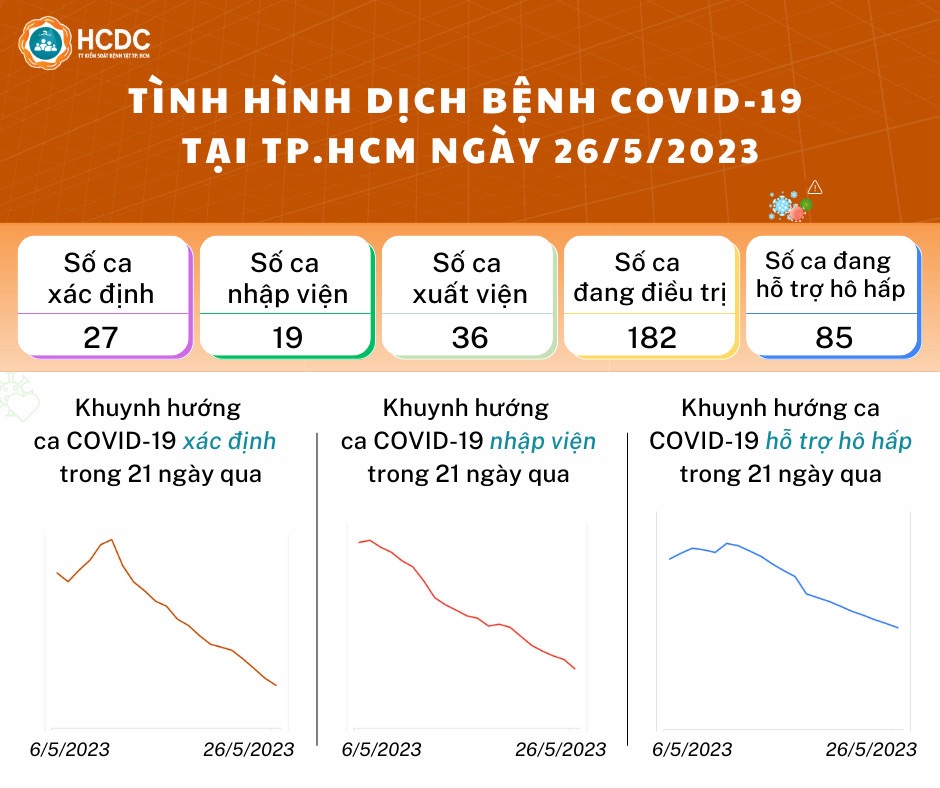 Tính từ 16g ngày 25/5/2023 đến 16g ngày 26/5/2023, TP.HCM ghi nhận: 27 ca mắc mới COVID-19, 19 ca nhập viện, 36 ca xuất viện, 182 ca đang điều trị, 85 trường hợp cần hỗ trợ hô hấp.