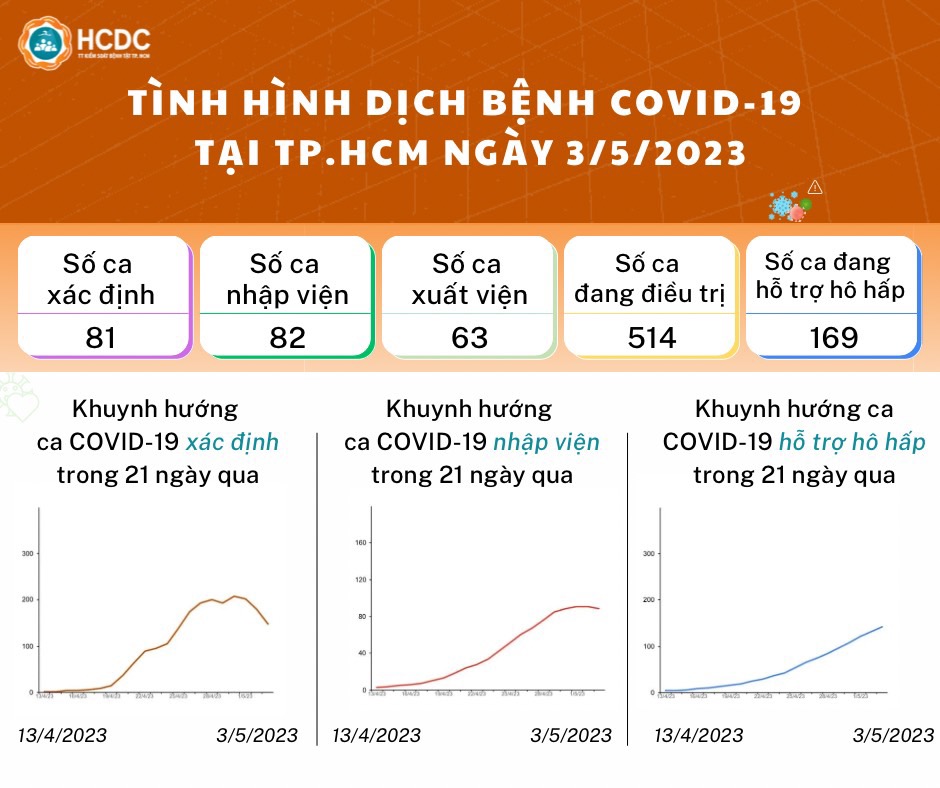 Tính từ 16g ngày 2/5/2023 đến 16g ngày 3/5/2023, TP.HCM ghi nhận: 81 ca mắc mới COVID-19, 82 ca nhập viện, 63 ca xuất viện, 514 ca đang điều trị, 169 trường hợp cần hỗ trợ hô hấp.