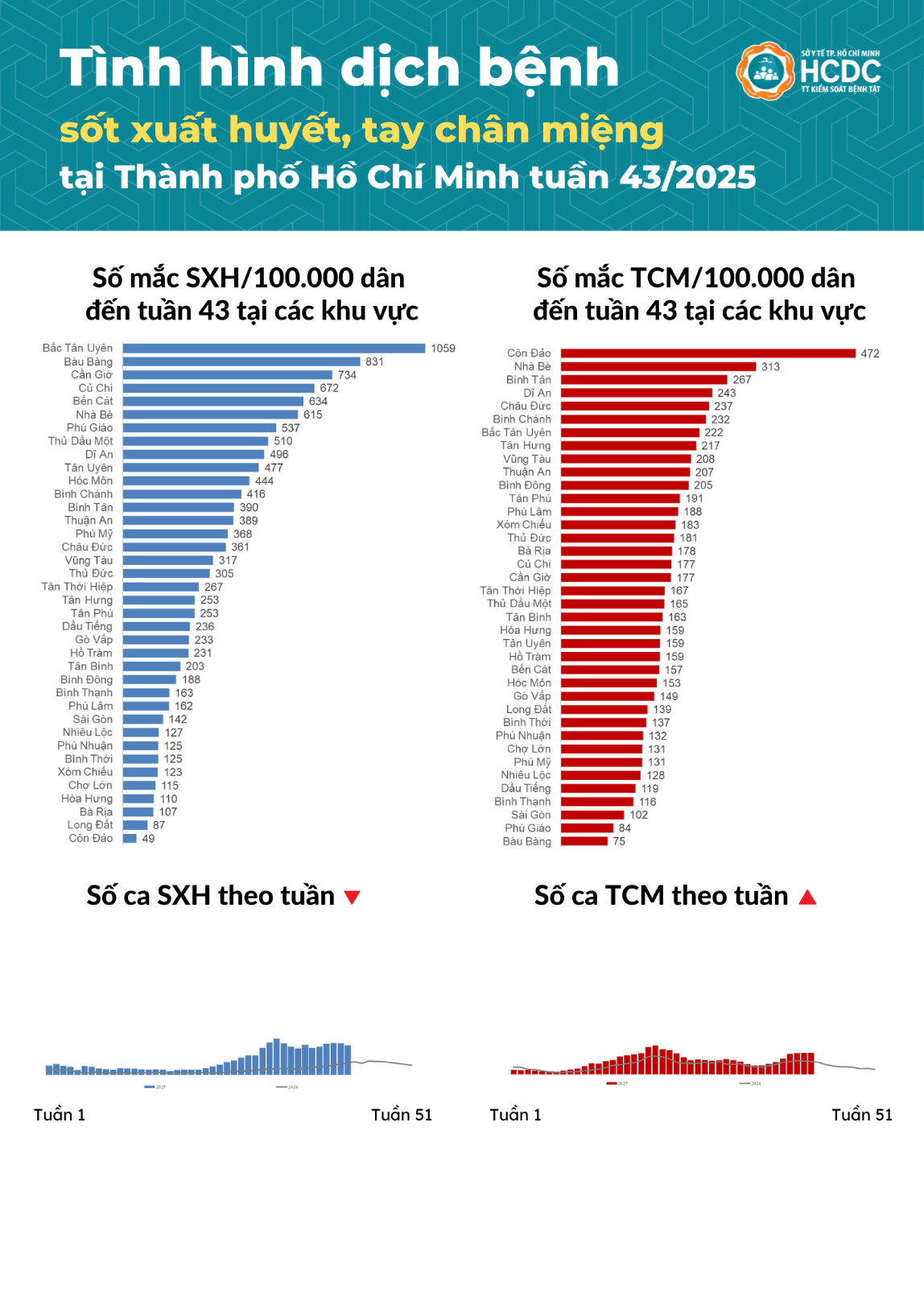 Tính từ ngày 20/10/2025 đến ngày 26/10/2025 (tuần 43), trên địa bàn TP. Hồ Chí Minh ghi nhận 2.200 trường hợp mắc bệnh sốt xuất huyết, giảm 3,7% so với trung bình 4 tuần trước. Tổng số ca sốt xuất huyết tích lũy từ đầu năm 2025 đến tuần 43 là 48.053 ca. Các khu vực có số ca mắc sốt xuất huyết trên 100.000 dân cao bao gồm Bắc Tân Uyên, Bàu Bàng và Cần Giờ.