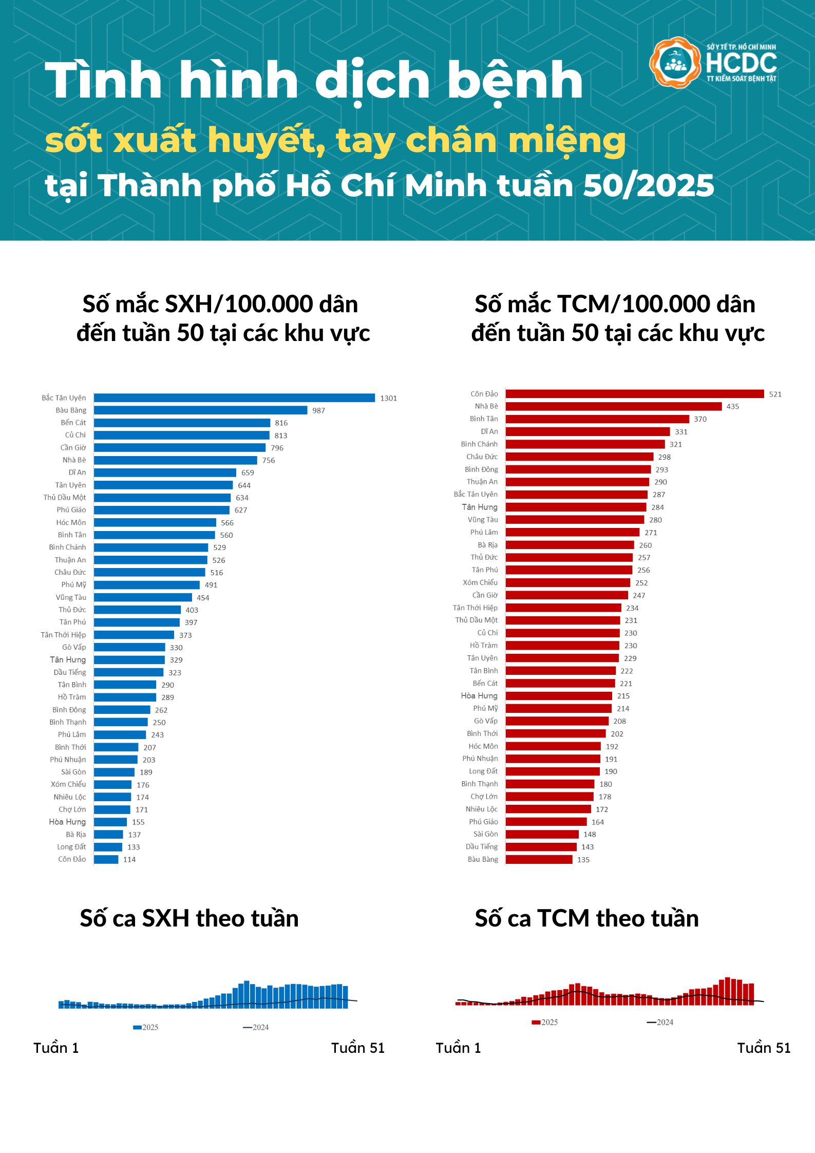 Trong tuần 50, TP. Hồ Chí Minh cũng ghi nhận 1.298 trường hợp mắc bệnh tay chân miệng, giảm 13,4% so với trung bình 4 tuần trước. Tổng số ca tay chân miệng tích lũy từ đầu năm 2025 đến tuần 50 là 36.786 ca. Các khu vực có số ca mắc TCM trên 100.000 dân cao bao gồm Côn Đảo, Nhà Bè và Bình Tân.