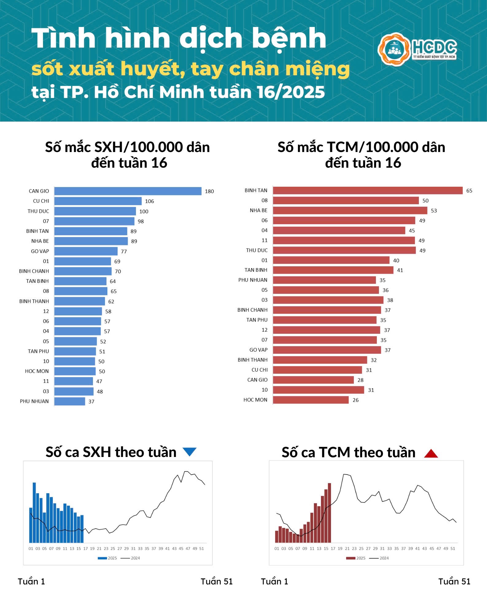 Tính từ ngày 14/04/2025 đến ngày 20/04/2025 (tuần 16), tại TP. Hồ Chí Minh ghi nhận 290 trường hợp mắc bệnh sốt xuất huyết, giảm 13,8% so với trung bình 4 tuần trước. Tổng số ca sốt xuất huyết tích lũy từ đầu năm 2025 đến tuần 16 là 6.624 ca. Các quận huyện có số ca mắc trên 100.000 dân cao bao gồm huyện Cần Giờ, Củ Chi và TP. Thủ Đức.