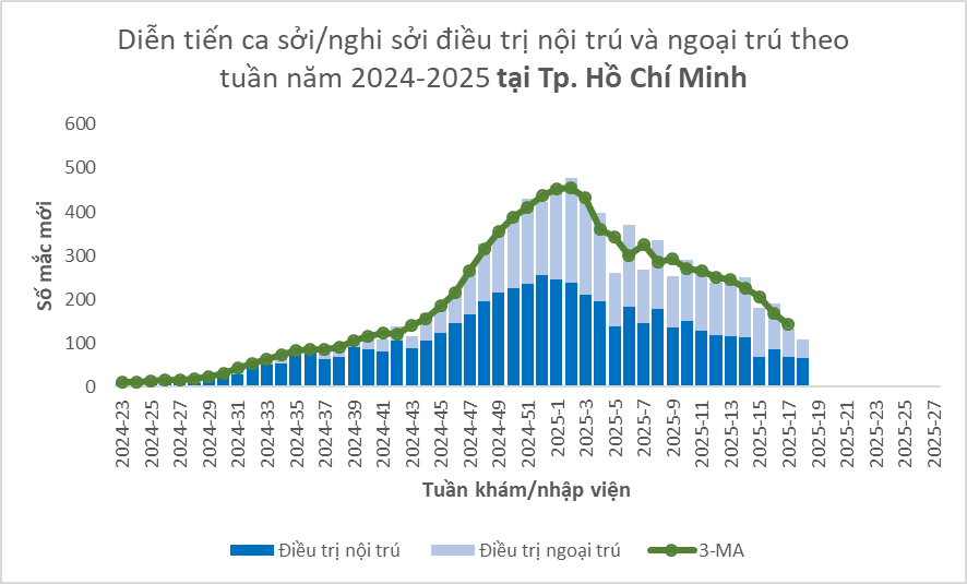 Biểu đồ diễn tiến ca sởi theo tuần năm 2025 tại TP. Hồ Chí Minh