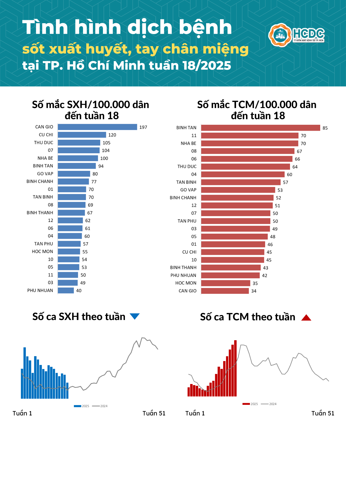 Tính từ ngày 28/04/2025 đến ngày 04/05/2025 (tuần 18), tại TP. Hồ Chí Minh ghi nhận 196 trường hợp mắc bệnh sốt xuất huyết, giảm 34,2% so với trung bình 4 tuần trước. Tổng số ca sốt xuất huyết tích lũy từ đầu năm 2025 đến tuần 18 là 7.131 ca. Các quận huyện có số ca mắc trên 100.000 dân cao bao gồm huyện Cần Giờ, Củ Chi và TP. Thủ Đức.