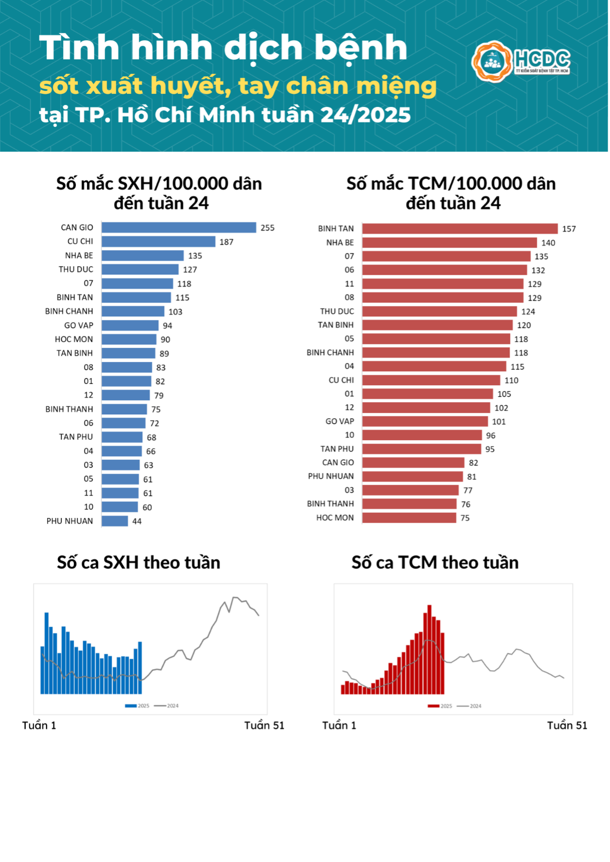 Tính từ ngày 09/06/2025 đến ngày 15/06/2025 (tuần 24), tại TP. Hồ Chí Minh ghi nhận 404 trường hợp mắc bệnh sốt xuất huyết, tăng 35% so với trung bình 4 tuần trước. Tổng số ca sốt xuất huyết tích lũy từ đầu năm 2025 đến tuần 24 là 9.029 ca. Các quận huyện có số ca mắc trên 100.000 dân cao bao gồm huyện Cần Giờ, Củ Chi và Nhà Bè.