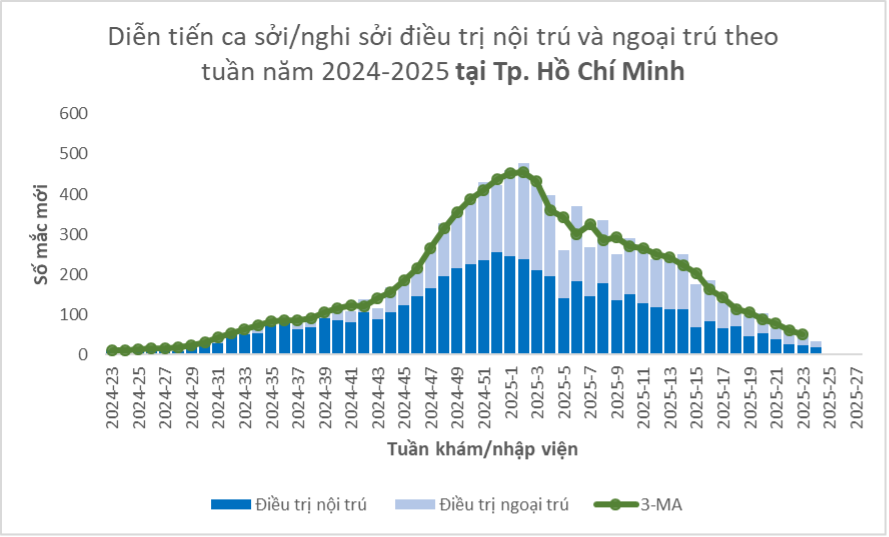Tuần 24, TP. Hồ Chí Minh ghi nhận 33 ca sởi có địa chỉ tại Thành phố, giảm 53,8% so với trung bình 4 tuần trước. Tổng số ca sởi tích lũy từ đầu dịch đến tuần 24/2025 là 9.599 ca. Các quận huyện có số ca mắc cao đến tuần 24/2025 bao gồm huyện Bình Chánh, quận Bình Tân và TP. Thủ Đức.