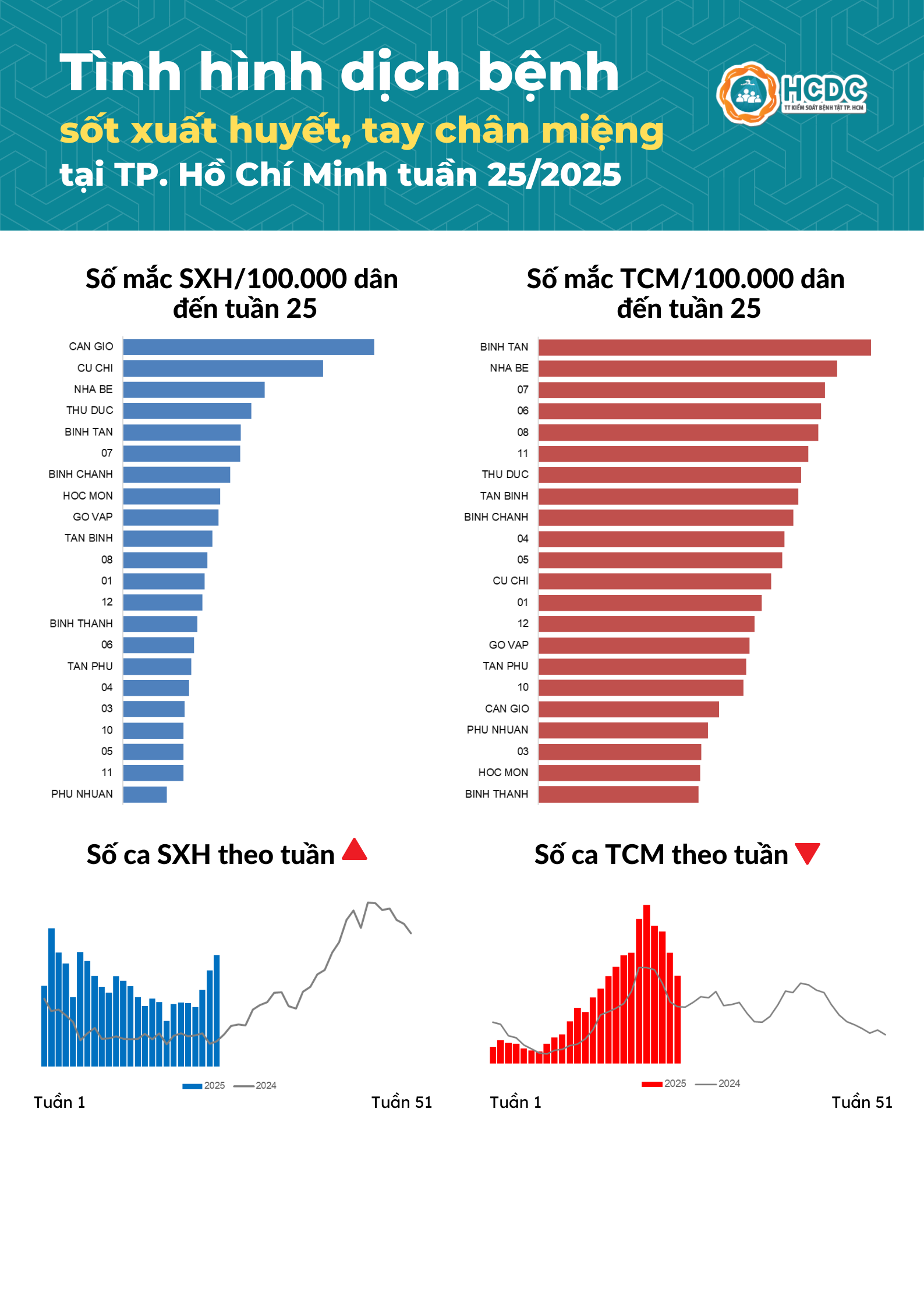 Tính từ ngày 16/06/2025 đến 22/06/2025 (tuần 25), tại TP. Hồ Chí Minh ghi nhận 507 trường hợp mắc bệnh sốt xuất huyết, tăng 50,9% so với trung bình 4 tuần trước. Tổng số ca sốt xuất huyết tích lũy từ đầu năm 2025 đến tuần 25 là 9.571 ca. Các quận huyện có số ca mắc trên 100.000 dân cao bao gồm huyện Cần Giờ, Củ Chi và Nhà Bè.