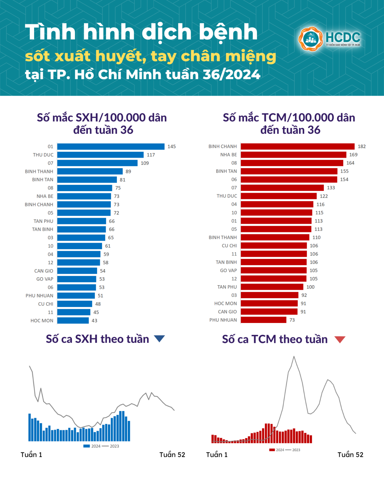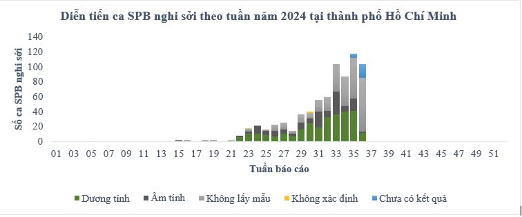 Trong tuần 36, TP. Hồ Chí Minh cũng ghi nhận 226 trường hợp mắc bệnh sốt xuất huyết, thấp hơn 1/4 so với trung bình 4 tuần trước. Tổng số ca sốt xuất huyết tích lũy từ đầu năm 2024 đến tuần 36 là 6.634 ca. Các quận huyện có số ca mắc trên 100.000 dân cao bao gồm Quận 1, thành phố Thủ Đức và Quận 7.