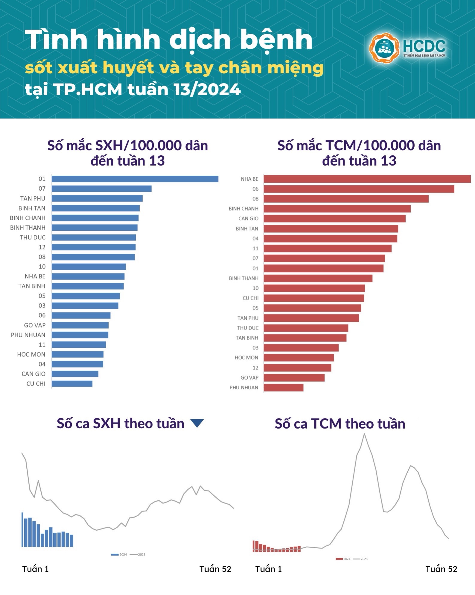 Trong tuần 13, TP. Hồ Chí Minh cũng ghi nhận 108 trường hợp mắc bệnh sốt xuất huyết, giảm 1/6 so với trung bình 4 tuần trước. Tổng số ca sốt xuất huyết tích lũy từ đầu năm 2024 đến tuần 13 là 2.308 ca. Các quận huyện có số ca mắc trên 100.000 dân cao bao gồm Quận 1, Quận 7 và quận Tân Phú.