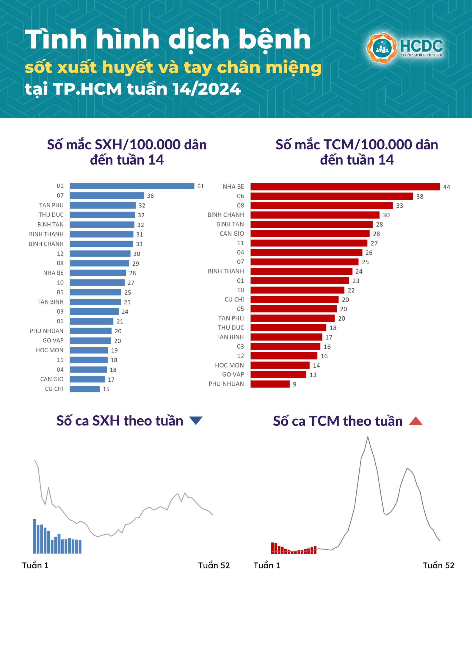 Trong tuần 14, TP. Hồ Chí Minh cũng ghi nhận 119 trường hợp mắc bệnh sốt xuất huyết, giảm 6,7% so với trung bình 4 tuần trước. Tổng số ca sốt xuất huyết tích lũy từ đầu năm 2024 đến tuần 14 là 2.442 ca. Các quận huyện có số ca mắc trên 100.000 dân cao bao gồm Quận 1, Quận 7 và quận Tân Phú.