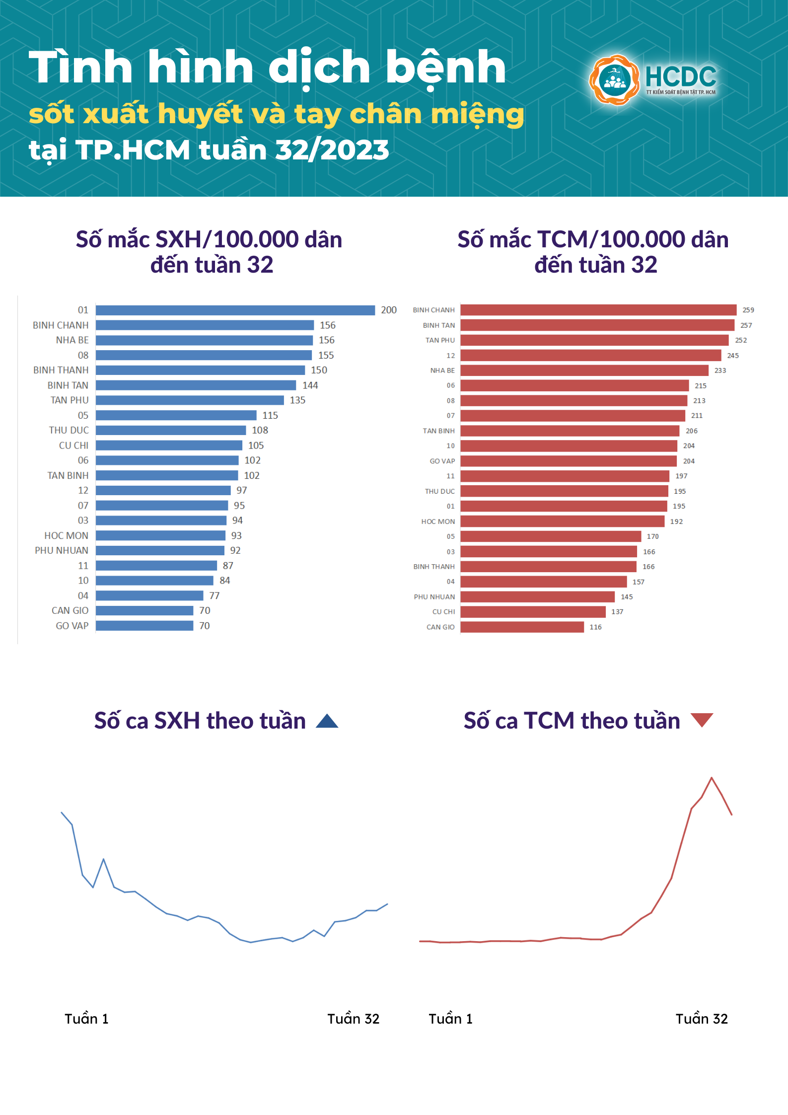 Trong tuần 32, TP. Hồ Chí Minh cũng ghi nhận 350 trường hợp mắc bệnh sốt xuất huyết, tăng 19,1% so với trung bình 4 tuần trước. Các quận huyện có số ca mắc trên 100.000 dân cao bao gồm Quận 1, huyện Bình Chánh và huyện Nhà Bè.