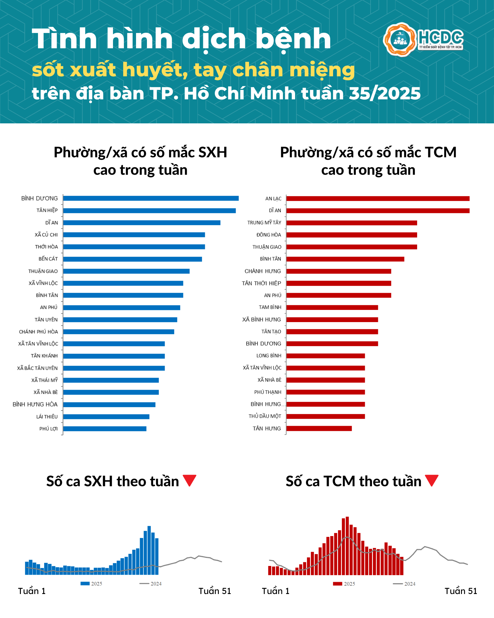 Trong tuần 35, trên địa bàn Thành phố Hồ Chí Minh cũng ghi nhận 405 trường hợp mắc bệnh tay chân miệng, giảm 33% so với trung bình 4 tuần trước. Tổng số ca tay chân miệng tích lũy từ đầu năm 2025 đến tuần 35 là 20.299 ca. Các phường, xã có số ca mắc cao bao gồm An Lạc, Dĩ An, Trung Mỹ Tây.