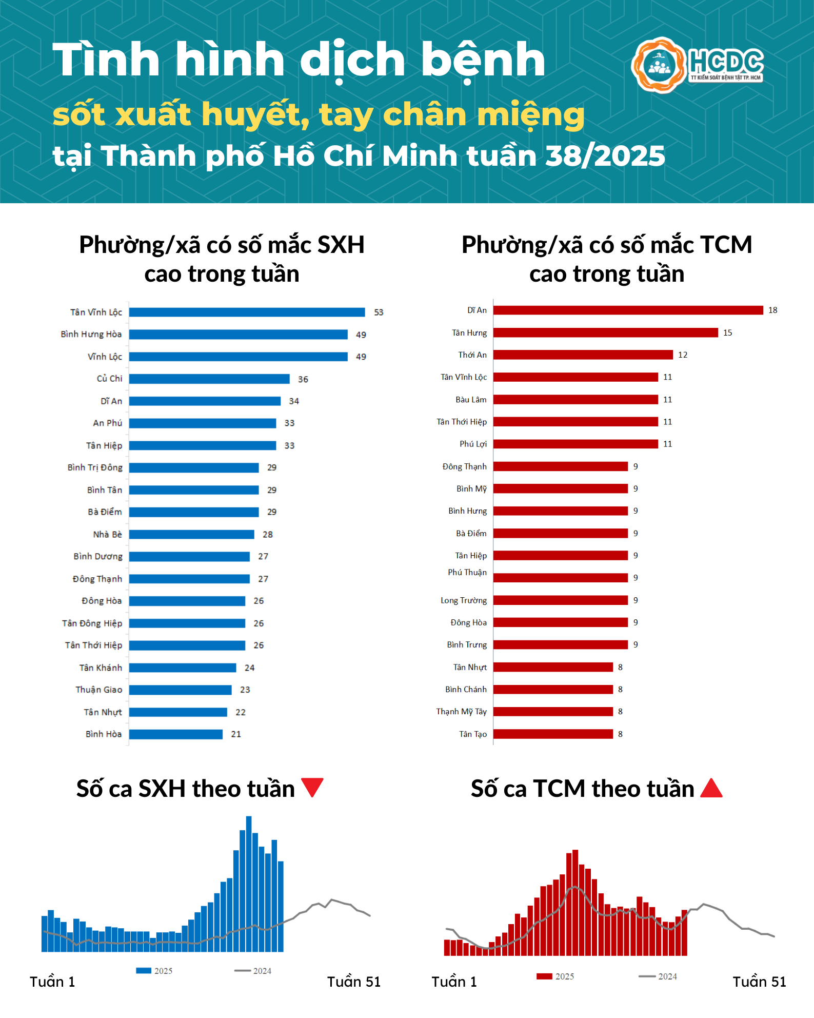 Tính từ ngày 15-21/9/2025 (tuần 38), trên địa bàn Thành phố Hồ Chí Minh ghi nhận 1.801 trường hợp mắc bệnh sốt xuất huyết, giảm 16,7% so với trung bình 4 tuần trước. Tổng số ca sốt xuất huyết tích lũy từ đầu năm 2025 đến tuần 38 là 36.232 ca. Các phường, xã có số ca mắc cao bao gồm Tân Vĩnh Lộc, Bình Hưng Hòa, Vĩnh Lộc.