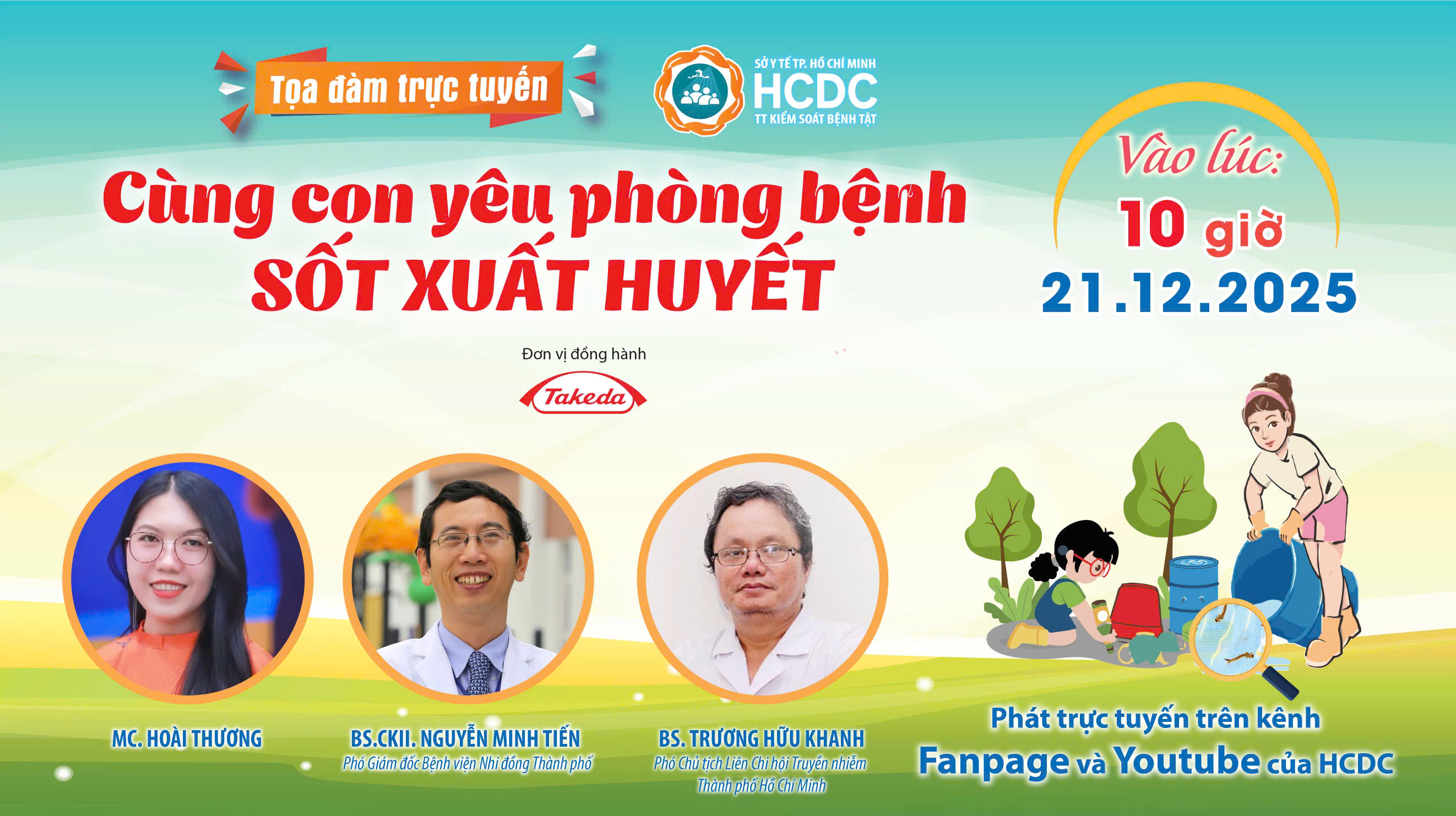 Chỉ còn 2 giờ nữa, buổi tọa đàm trực tuyến “Cùng con yêu phòng bệnh sốt xuất huyết” sẽ chính thức được lên sóng. Đây là cơ hội để quý phụ huynh trang bị những kiến thức quan trọng, giúp bảo vệ con yêu trước dịch bệnh sốt xuất huyết. Chương trình được phát sóng trực tiếp trên Fanpage và Youtube của Trung tâm Kiểm soát bệnh tật Thành phố Hồ Chí Minh vào lúc 10 giờ, ngày 21/12/2025.