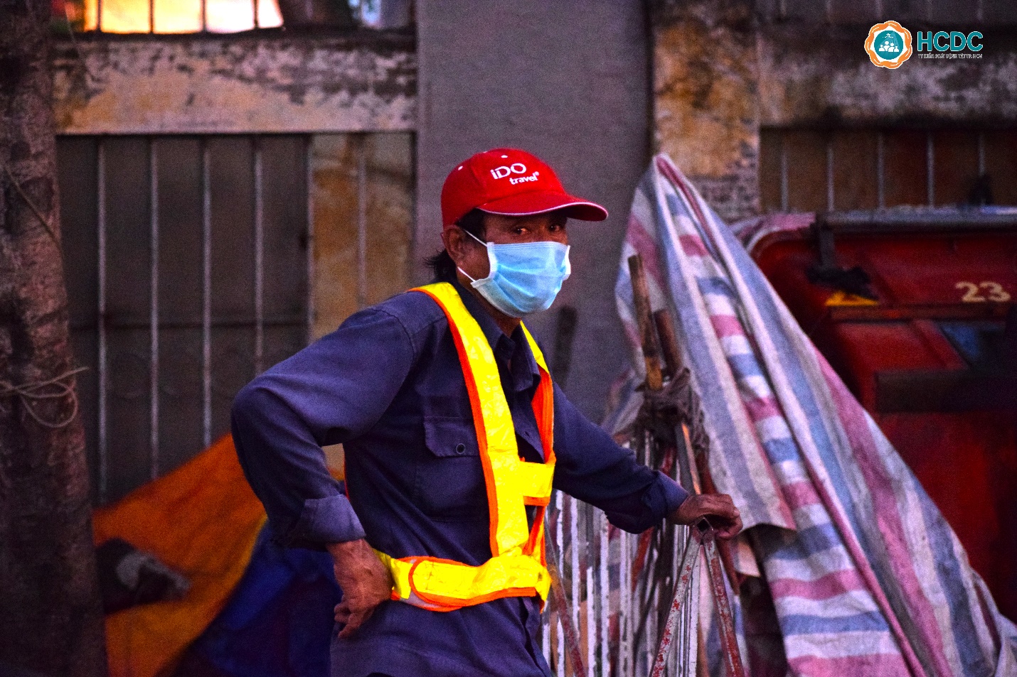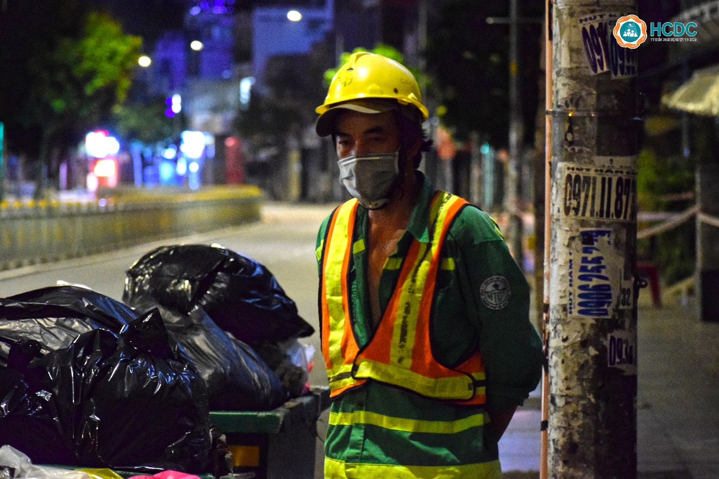 Người công nhân vệ sinh đứng nghỉ bên đường trước khi tiếp tục công việc vệ sinh khu vực Bến xe quận 8