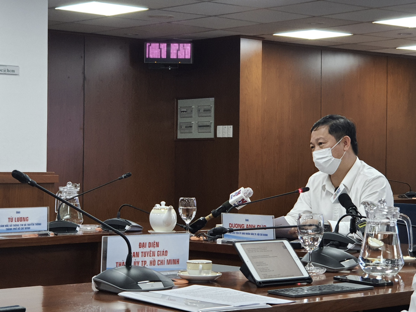 Chiều 28/6/2021, Phó chủ tịch UBND TP. Hồ Chí Minh Dương Anh Đức chủ trì buổi họp báo cung cấp thông tin về công tác phòng, chống dịch Covid-19 trên địa bàn Thành phố, cùng dự có lãnh đạo Sở Thông tin – Truyền thông, Sở Y tế và Sở Giáo dục - Đào tạo.
