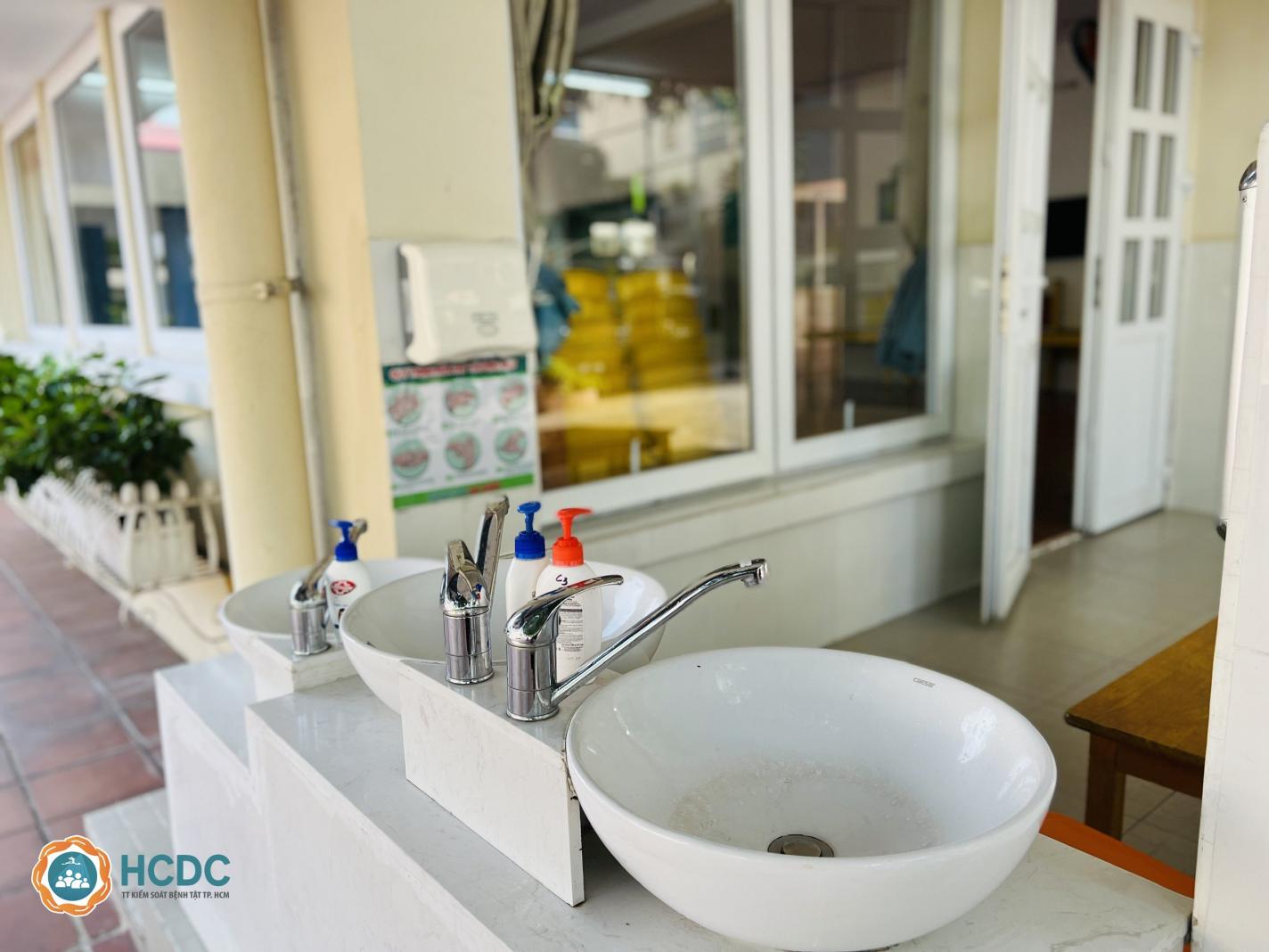 Ảnh: Trước mỗi lớp có khu vực rửa tay, được chuẩn bị xà bông, khăn giấy đầy đủ