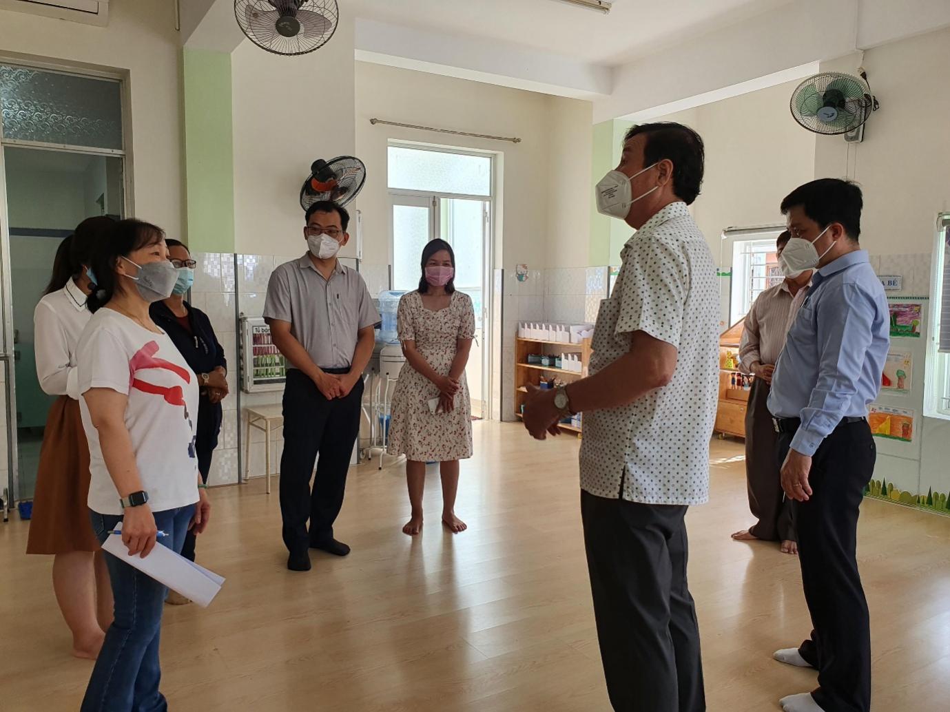 Đoàn giám sát làm việc cùng ban giám hiệu trường mầm non Tân Định để đảm bảo điều kiện an toàn nhất khi các bé quay lại trường học (Q1)