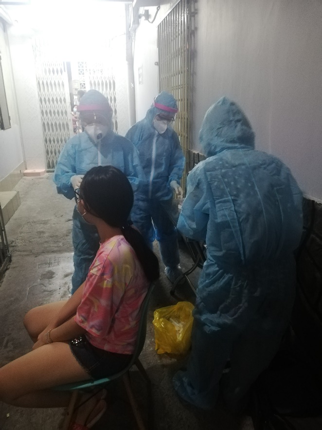 Ảnh: Khử khuẩn và lấy mẫu các trường hợp tiếp xúc gần ngay tại nhà trường hợp test nhanh SARS-CoV-2 dương tính tại Campuchia tại Q.11 – Trung tâm Y tế Q.11