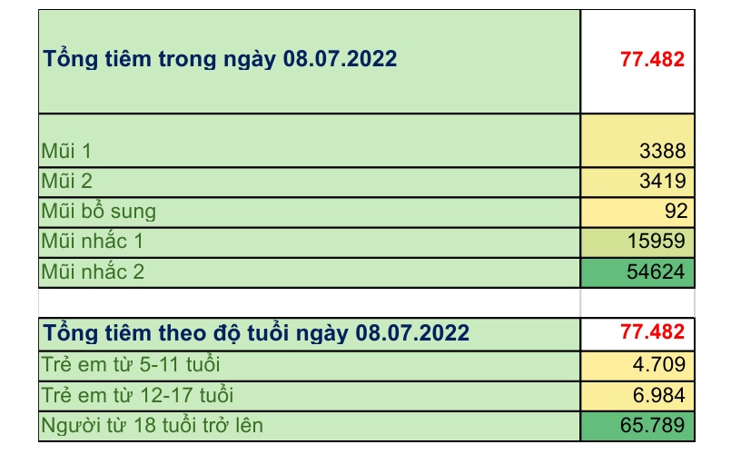Tính đến hết ngày 08/07/2022, tổng số mũi vắc xin đã tiêm: 21.847.500 mũi (bao gồm 8.506.027 mũi 1; 7.562.008 mũi 2; 685.361 mũi bổ sung; 4.435.681 mũi nhắc lần 1; 658.423 mũi nhắc lần 2).