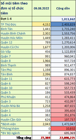 Tính đến hết ngày 09/08/2022, Toàn Thành phố đã tiêm được 22.890.221 mũi (bao gồm 8.589.161 mũi 1; 7.654.505 mũi 2; 687.864 mũi bổ sung; 4.678.752 mũi nhắc lần 1; 1.279.939 mũi nhắc lần 2).