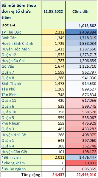 Tính đến hết ngày 11/08/2022, Toàn Thành phố đã tiêm được 22.949.010 mũi (bao gồm 8.602.519 mũi 1; 7.659.836 mũi 2; 688.111 mũi bổ sung; 4.693.470 mũi nhắc lần 1; 1.305.074 mũi nhắc lần 2).