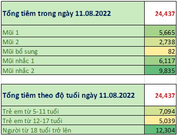 Trong ngày 11/08/2022: toàn thành phố đã tiêm được 24.437 mũi tiêm, bao gồm 5.665 mũi 1 (24%); 2.738 mũi 2 (11%); 82 mũi bổ sung (0,3%); 6.117 mũi nhắc lần 1 (25%); 9.835 mũi nhắc lần 2 (40%) tại 214 điểm tiêm. Trong đó: người từ 18 tuổi trở lên đã tiêm được 12.304 mũi (50%); trẻ từ 12 đến dưới 18 tuổi: đã tiêm được 5.039 mũi (21%); trẻ từ 05 đến dưới 12 tuổi: đã tiêm được 7.094 mũi (29%).