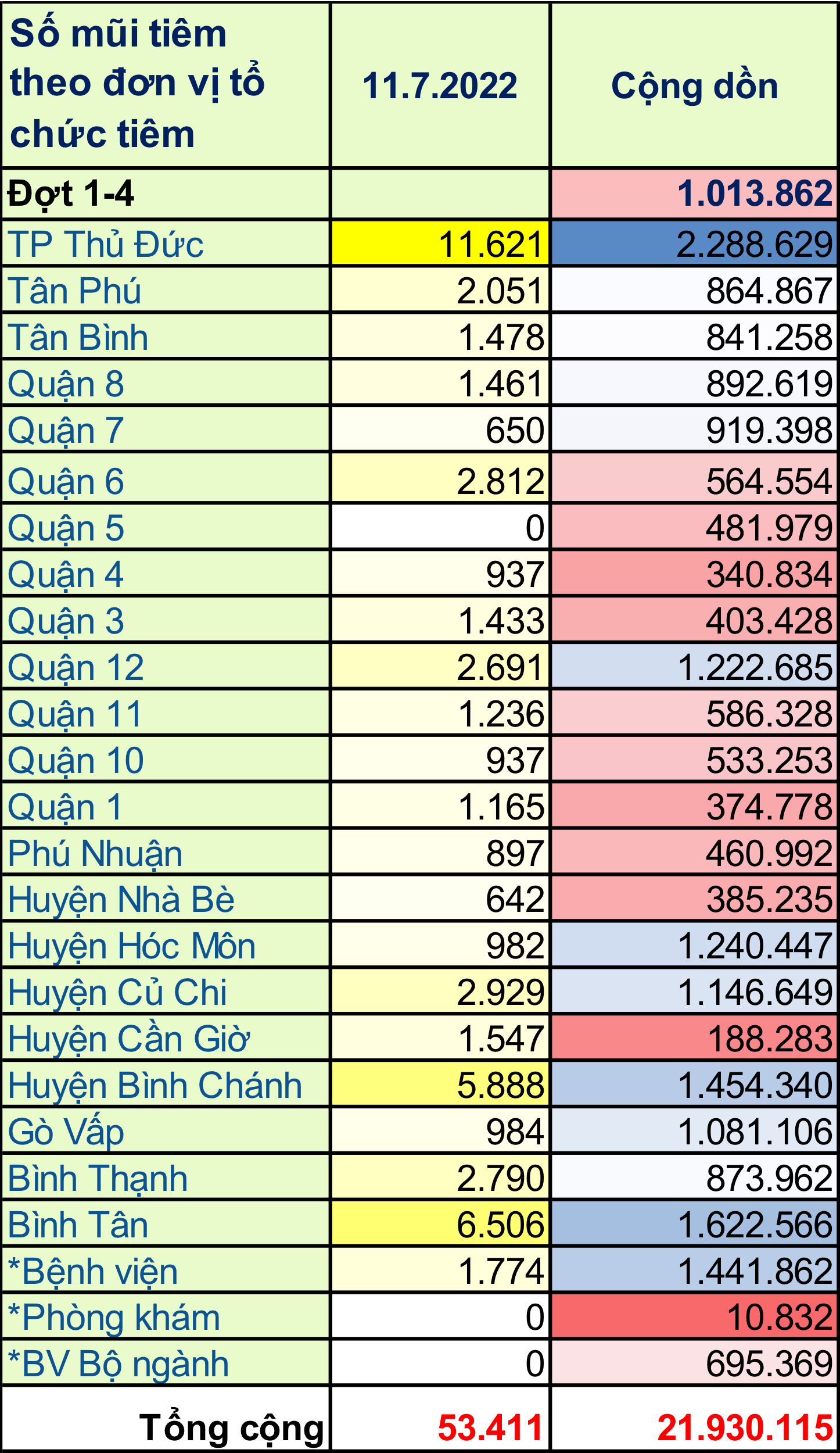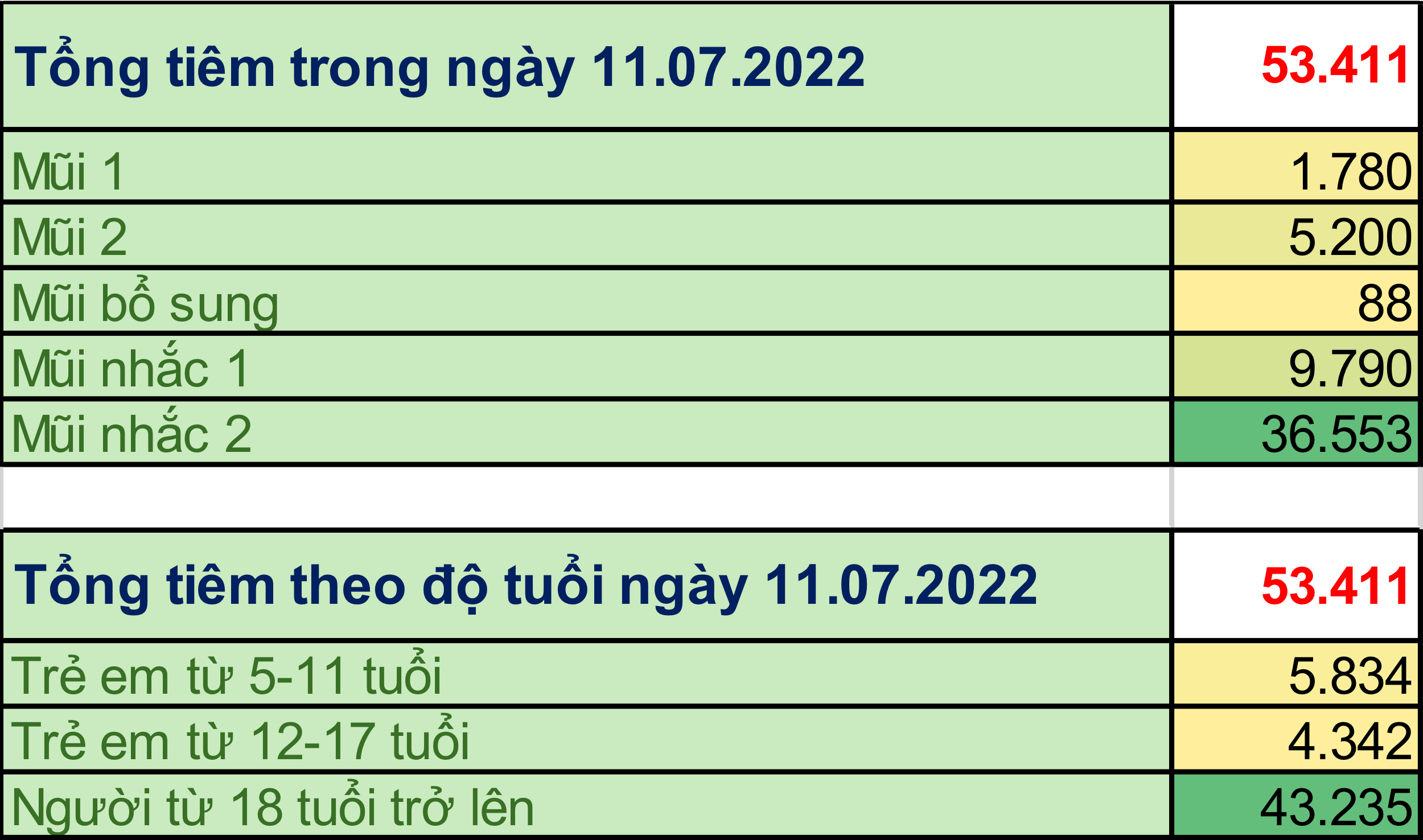 Trong ngày 11/07/2022: toàn thành phố đã tiêm được 53.411 mũi tiêm, bao gồm 1.780 mũi 1 (3%); 5.200 mũi 2 (10%); 88 mũi bổ sung (0,2%); 9.790 mũi nhắc lần 1 (18%); 36.553 mũi nhắc lần 2 (69%) tại 172 điểm tiêm. Trong đó: người từ 18 tuổi trở lên đã tiêm được 43.235 mũi (81%); trẻ từ 12 đến dưới 18 tuổi: đã tiêm được 4.342 mũi (8%); trẻ từ 05 đến dưới 12 tuổi: đã tiêm được 5.834 mũi (11%).