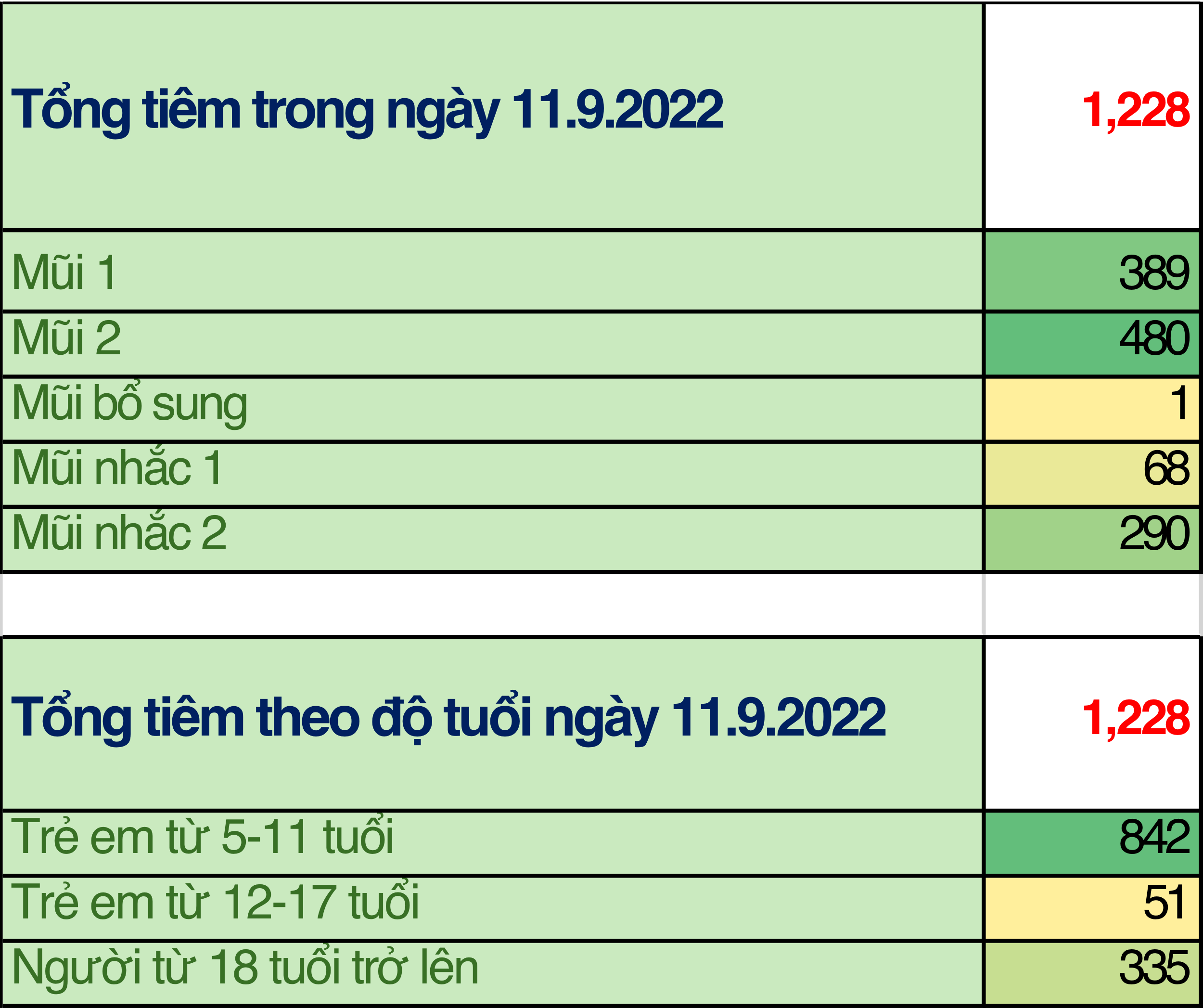 Trong ngày 11/9/2022: toàn thành phố đã tiêm được 1.228 mũi tiêm, bao gồm 389 mũi 1 (32%); 480 mũi 2 (38%); 1 mũi bổ sung (0,08%); 68 mũi nhắc lần 1 (6%); 290 mũi nhắc lần 2 (24%) tại 31 điểm tiêm. Trong đó: người từ 18 tuổi trở lên đã tiêm được 335 mũi (24%); trẻ từ 12 đến dưới 18 tuổi: đã tiêm được 51 mũi (6%); trẻ từ 05 đến dưới 12 tuổi: đã tiêm được 842 mũi (70%).