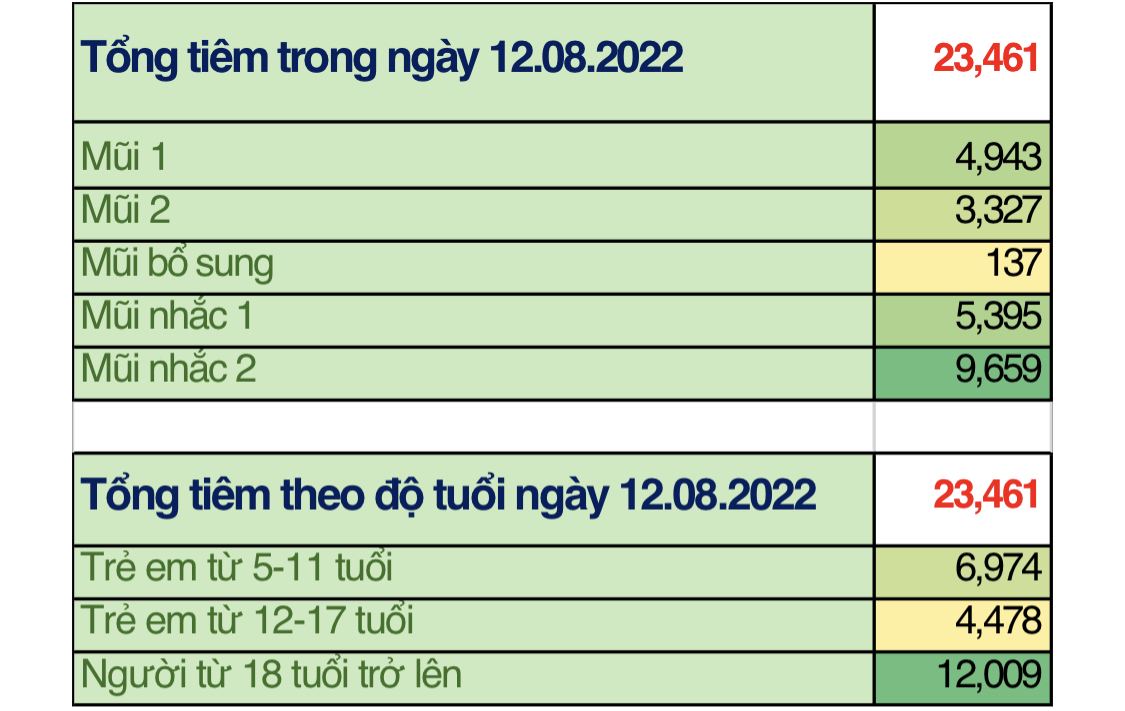 Trong ngày 12/08/2022: toàn thành phố đã tiêm được 23.461 mũi tiêm, bao gồm 4.943 mũi 1 (21%); 3.327 mũi 2 (14%); 137 mũi bổ sung (0,6%); 5.395 mũi nhắc lần 1(23%); 9.659 mũi nhắc lần 2 (42%) tại 200 điểm tiêm. Trong đó: người từ 18 tuổi trở lên đã tiêm được 12.009 mũi (51%); trẻ từ 12 đến dưới 18 tuổi: đã tiêm được4.478 mũi (19%); trẻ từ 05 đến dưới 12 tuổi: đã tiêm được 6.974 mũi (30%).