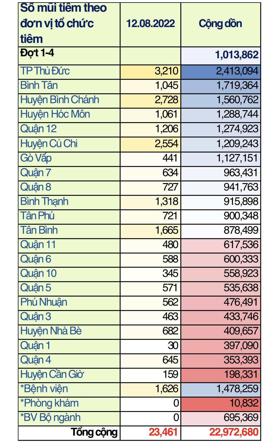 TP. Hồ Chí Minh: Cập nhật số liệu tiêm chủng vắc xin phòng chống COVID-19 ngày 12/08/2022