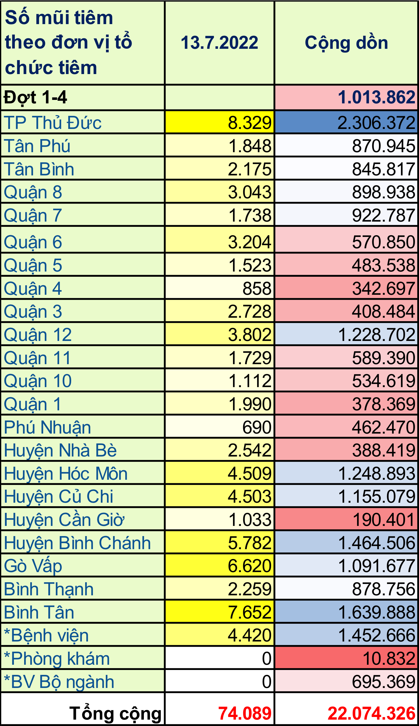 Trong ngày 13/07/2022: toàn thành phố đã tiêm được 74.089 mũi tiêm, bao gồm 3.457 mũi 1 (5%); 3.110 mũi 2 (4%); 122 mũi bổ sung (0,2%); 16.825 mũi nhắc lần 1 (23%); 50.575 mũi nhắc lần 2 (68%) tại 333 điểm tiêm. Trong đó: người từ 18 tuổi trở lên đã tiêm được 60.166 mũi (81%); trẻ từ 12 đến dưới 18 tuổi: đã tiêm được 9.038 mũi (12%); trẻ từ 05 đến dưới 12 tuổi: đã tiêm được 4.885 mũi (7%).
