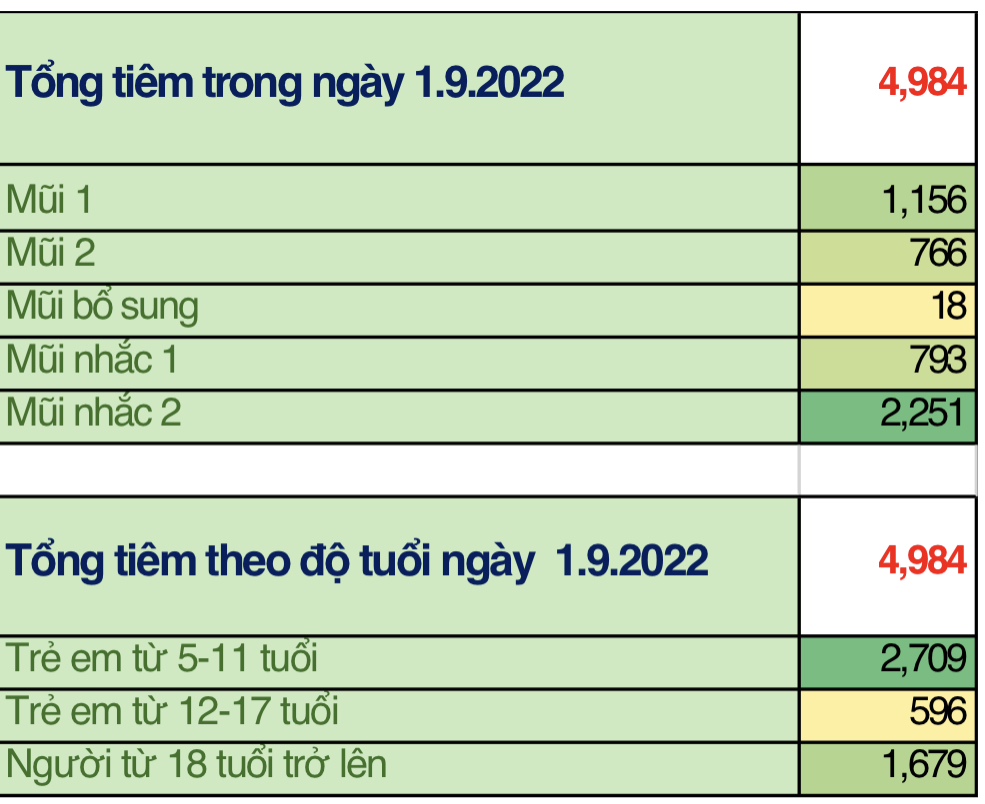 Trong ngày 1/9/2022: toàn thành phố đã tiêm được 4.984 mũi tiêm, bao gồm 1.156 mũi 1 (23%); 766 mũi 2 (16%); 18 mũi bổ sung (0,4%); 793 mũi nhắc lần 1 (16%); 2.251 mũi nhắc lần 2 (45%) tại 82 điểm tiêm. Trong đó: người từ 18 tuổi trở lên đã tiêm được 2.709 mũi (34%); trẻ từ 12 đến dưới 18 tuổi: đã tiêm được 596 mũi (12%); trẻ từ 05 đến dưới 12 tuổi: đã tiêm được 1.679 mũi (54%).