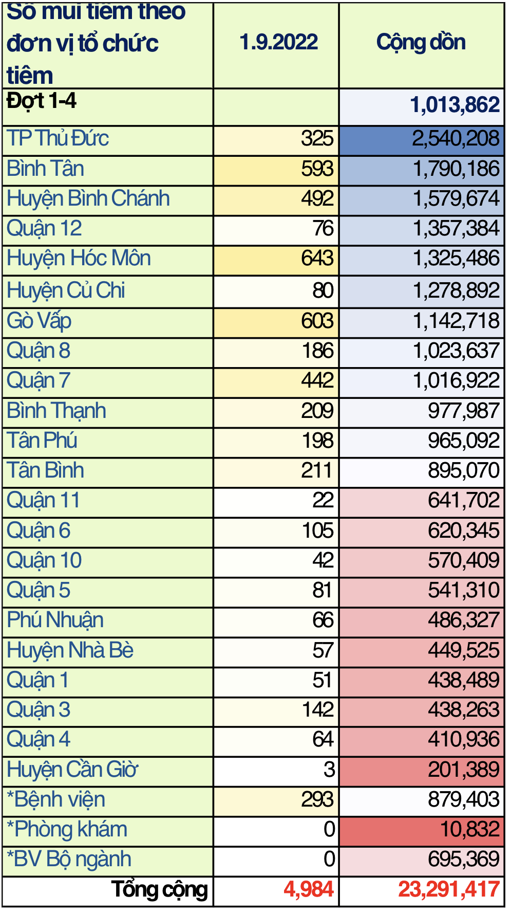 TP. Hồ Chí Minh: Cập nhật số liệu tiêm chủng vắc xin phòng chống COVID-19 ngày 1/9/2022