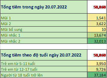 Trong ngày 20/07/2022: toàn thành phố đã tiêm được 50.860 mũi tiêm, bao gồm 1.541 mũi 1 (3%); 3.622 mũi 2 (7%); 10 mũi bổ sung (0,02%); 13.674 mũi nhắc lần 1 (27%); 32.013 mũi nhắc lần 2 (63%) tại 221 điểm tiêm. Trong đó: người từ 18 tuổi trở lên đã tiêm được 37.184 mũi (73%); trẻ từ 12 đến dưới 18 tuổi: đã tiêm được 9.726 mũi (19%); trẻ từ 05 đến dưới 12 tuổi: đã tiêm được 3.950 mũi (8%).