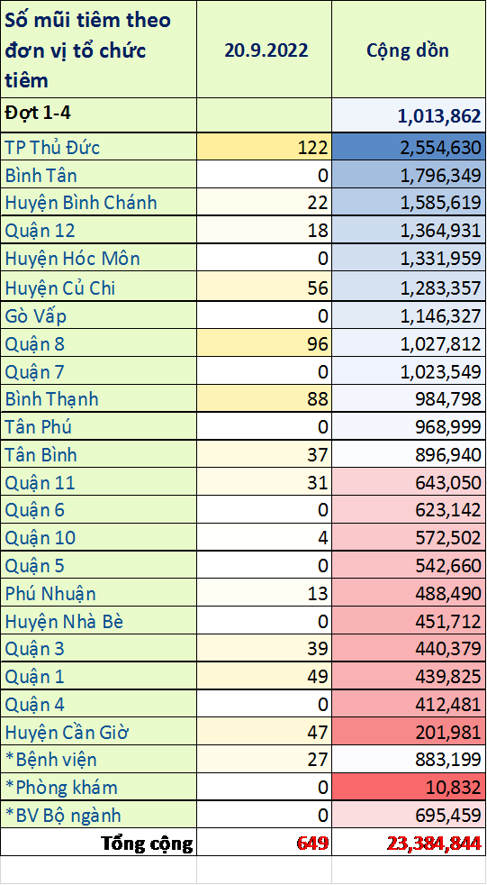 TP. Hồ Chí Minh: Cập nhật số liệu tiêm chủng vắc xin phòng chống COVID-19 ngày 20/9/2022