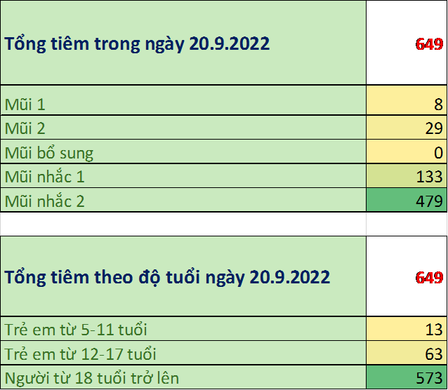 Trong ngày 20/9/2022: toàn thành phố đã tiêm được 649 mũi tiêm, bao gồm 8 mũi 1 (1%); 29 mũi 2 (5%); 0 mũi bổ sung (0%); 133 mũi nhắc lần 1 (20%); 479 mũi nhắc lần 2 (74%) tại 47 điểm tiêm. Trong đó: người từ 18 tuổi trở lên đã tiêm được 573 mũi (88%); trẻ từ 12 đến dưới 18 tuổi: đã tiêm được 63 mũi (10%); trẻ từ 05 đến dưới 12 tuổi: đã tiêm được 13 mũi (2%).