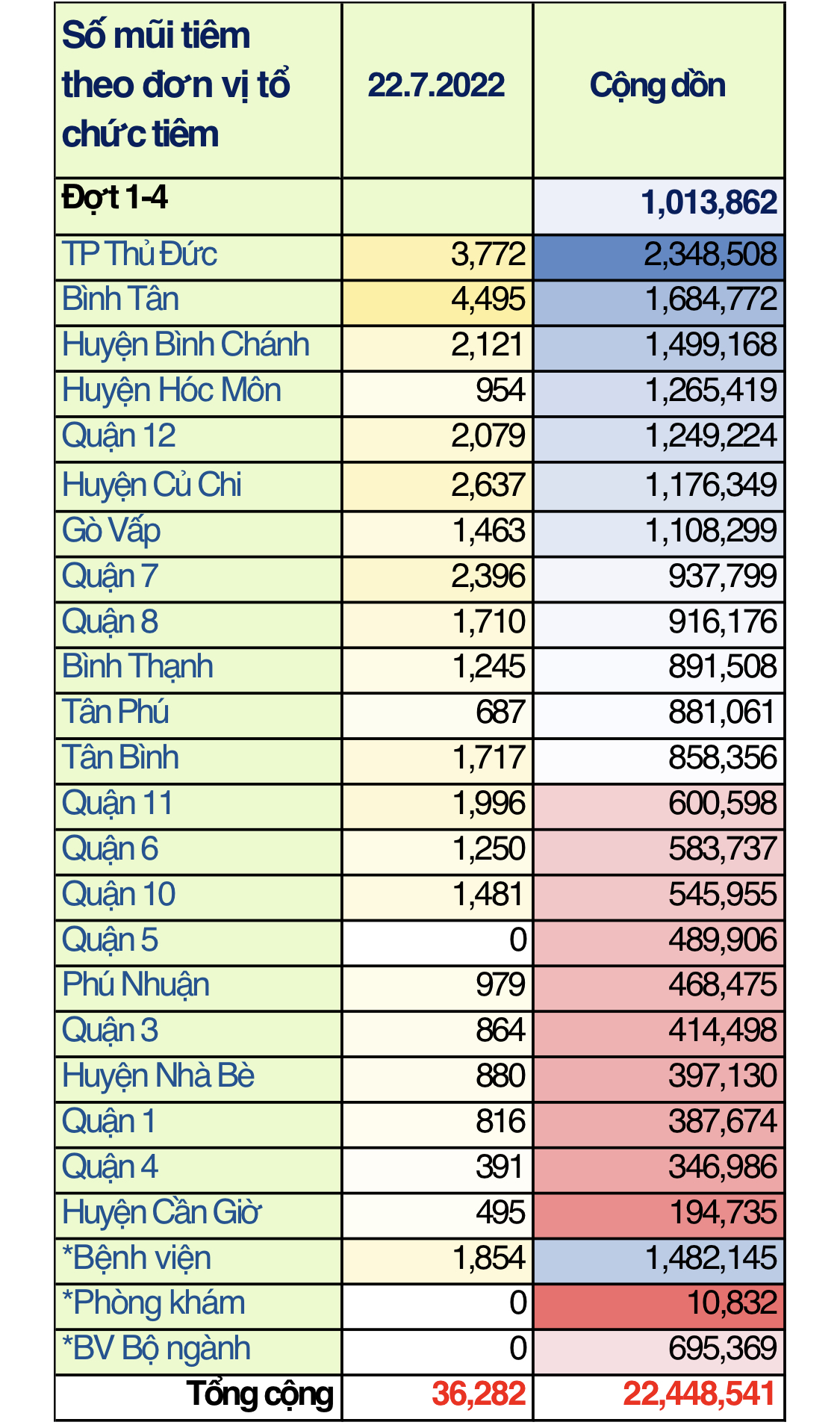 TP. Hồ Chí Minh: Cập nhật số liệu tiêm chủng vắc xin phòng chống COVID-19 ngày 22/7/2022