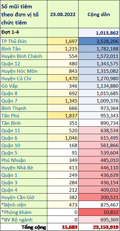 TP. Hồ Chí Minh: Cập nhật số liệu tiêm chủng vắc xin phòng chống COVID-19 ngày 23/08/2022