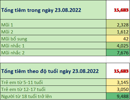 Trong ngày 23/08/2022: toàn thành phố đã tiêm được 15.683 mũi tiêm, bao gồm 2.328 mũi 1 (15%); 1.612 mũi 2 (10%); 42 mũi bổ sung (0,3%); 4.025 mũi nhắc lần 1 (26%); 7.676 mũi nhắc lần 2 (49%) tại 177 điểm tiêm. Trong đó: người từ 18 tuổi trở lên đã tiêm được 9.488 mũi (60%); trẻ từ 12 đến dưới 18 tuổi: đã tiêm được 3.050 mũi (20%); trẻ từ 05 đến dưới 12 tuổi: đã tiêm được 3.145 mũi (20%).