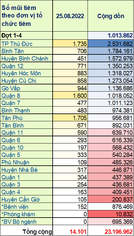 TP. Hồ Chí Minh: Cập nhật số liệu tiêm chủng vắc xin phòng chống COVID-19 ngày 25/8/2022