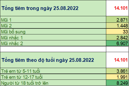 Trong ngày 25/8/2022, toàn thành phố đã tiêm được 14.101 mũi tiêm, bao gồm 2.871 mũi 1 (20%); 1.448 mũi 2 (10%); 33 mũi bổ sung (0,2%); 2.842 mũi nhắc lần 1 (20%); 6.907 mũi nhắc lần 2 (50%) tại 191 điểm tiêm. Trong đó: người từ 18 tuổi trở lên đã tiêm được 8.249 mũi (58%); trẻ từ 12 đến dưới 18 tuổi: đã tiêm được 1.991 mũi (14%); trẻ từ 05 đến dưới 12 tuổi: đã tiêm được 3.861 mũi (28%).